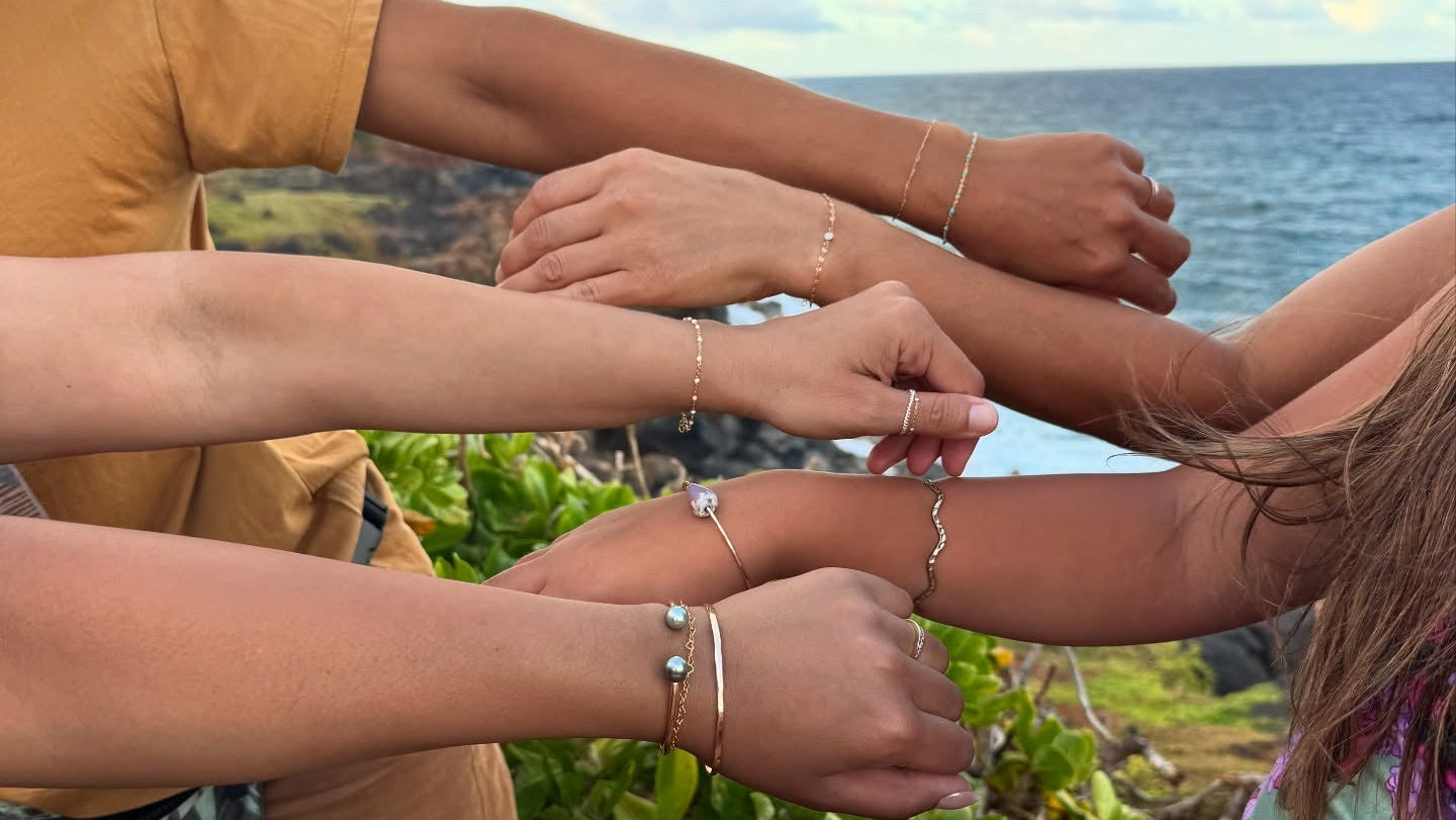 Choose from a curated selection of gold and silver chains with the option to add charms, pearls, and handpicked Kauai shells. Available as bracelets, necklaces, anklets, hand chains, or rings. Each piece is made to your personal vision.