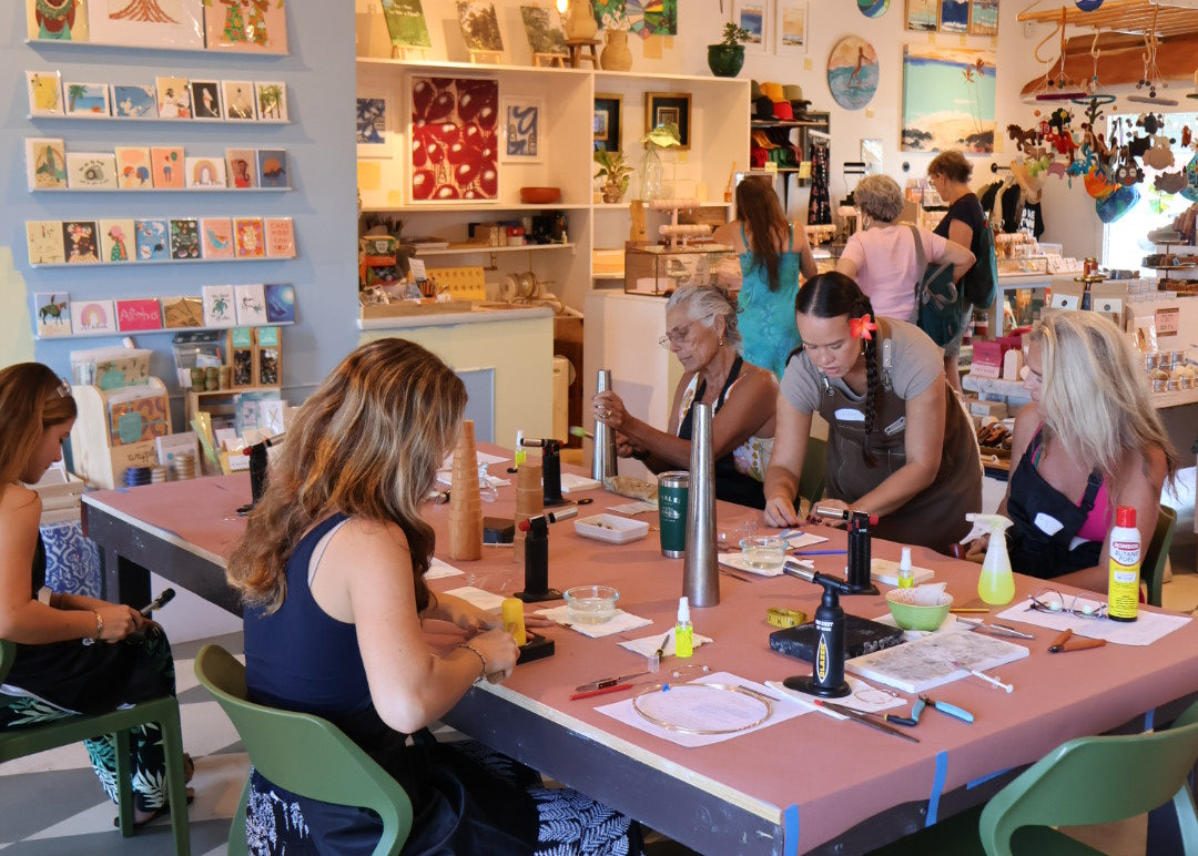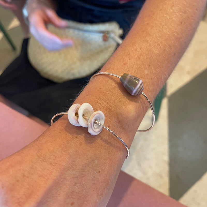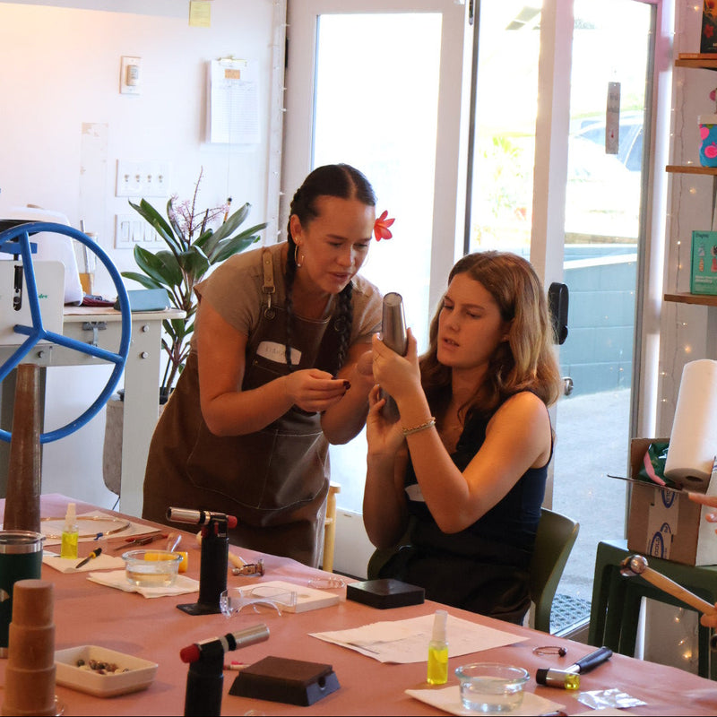 This 2-hour beginner-friendly workshop teaches soldering using gold-filled and fine silver metals. Each student will create two bangles. One bangle will be adorned with a shell or pearl, and the other will be left plain to focus on texturizing techniques.